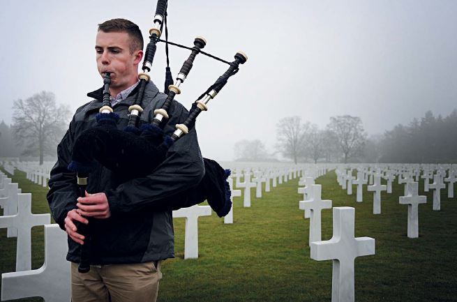Een doedelzakspeler speelt voor de gevallen mannen Foto's: Arnold Nilwik